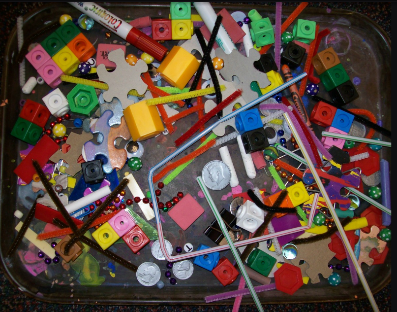 I created an "I spy" learning adventure. We borrowed brown trays from the cafeteria. We borrowed many objects from the art room and we included numbers, letters, blocks, pencils, pens, paperclips and a multitude of other objects. Some of the objects were just distractors. Other objects were somewhat educational. For example: The number eight, in this picture, was used to be an object so that other people could find it on a webpage. One's ability to identify a number is relatively important and slightly involves math.